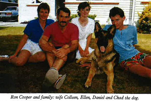 BACK AT the Lower Hutt house with the neatly trimmed lawns, the board fence and a new police-trained Alsatian dog called Chad, Ron Cooper slops around in blue shorts, hot pink tee shirt and jandals, working on putting his life back together.